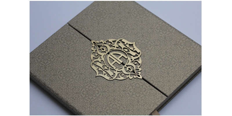 Faire part de mariage de luxe avec une decoupe au laser au centre de l'etui. Vous pouvez choisir la dimension et le design de la decoupe laser. Autour de la decoupe laser vous avez une impression personnalisable avec votre propre dessin..